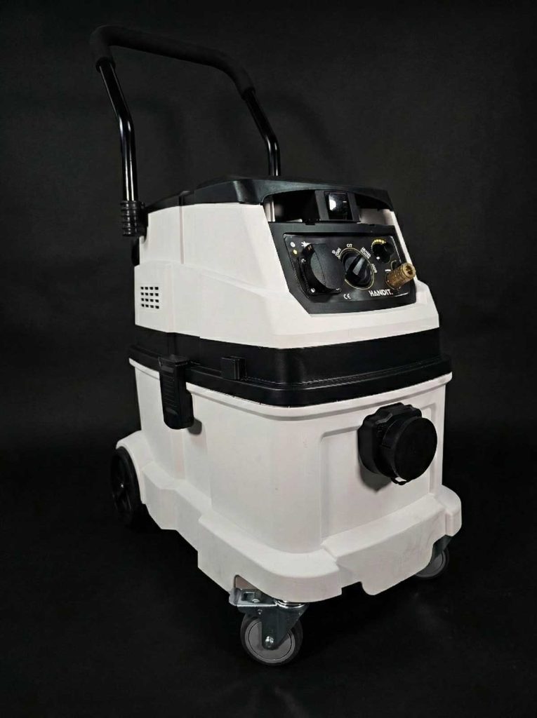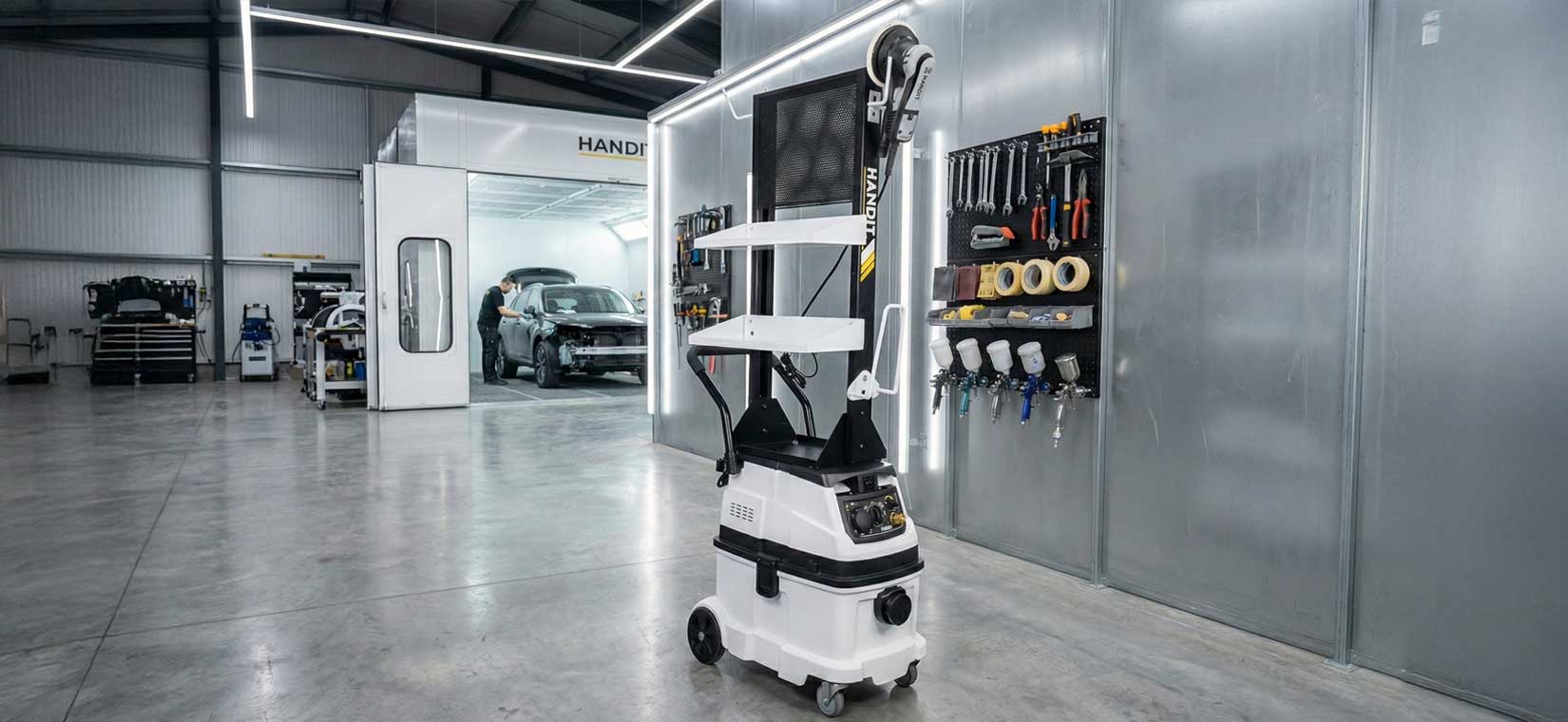 La estación de trabajo HANDIT es un sistema completo diseñado para centralizar el lijado y la aspiración en un único punto de trabajo. Combina una aspiradora profesional de gran capacidad con un soporte superior para herramientas y accesorios, creando un conjunto estable, compacto y altamente funcional. Su diseño optimiza el orden, reduce tiempos improductivos y mejora la limpieza del entorno, permitiendo trabajar de forma más eficiente y controlada.